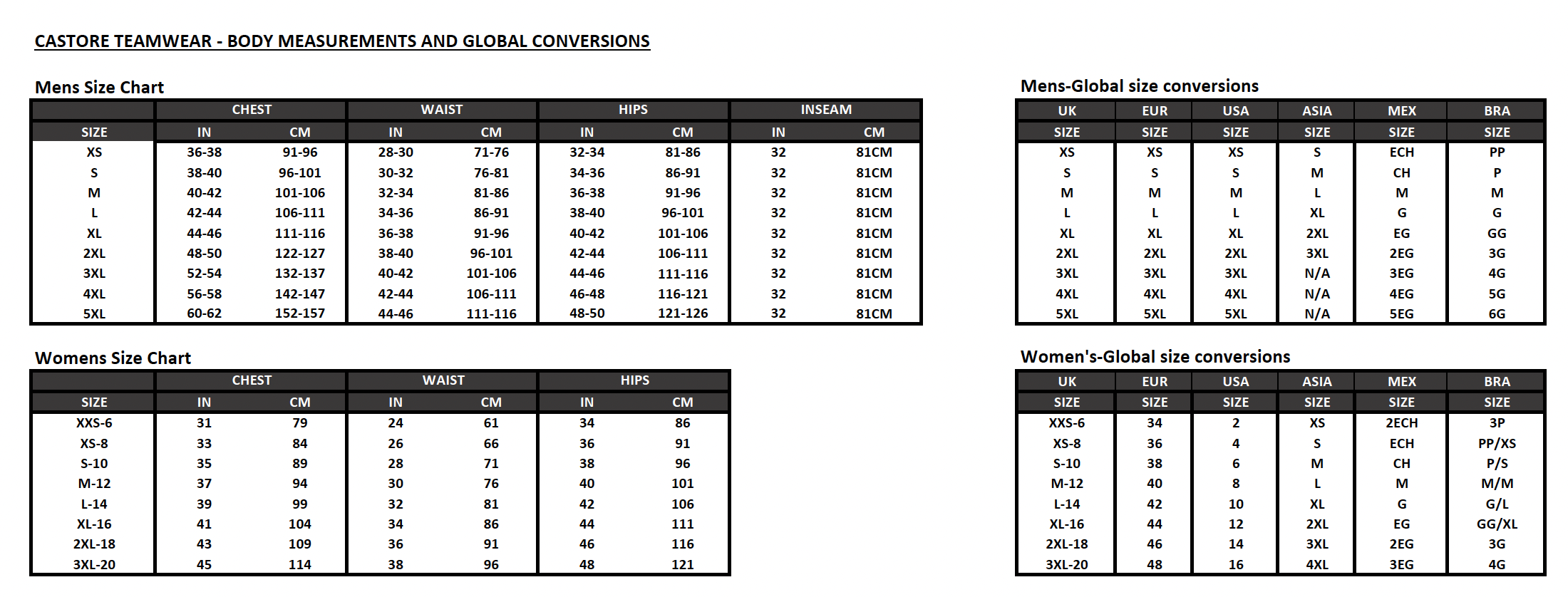 Sizing chart: