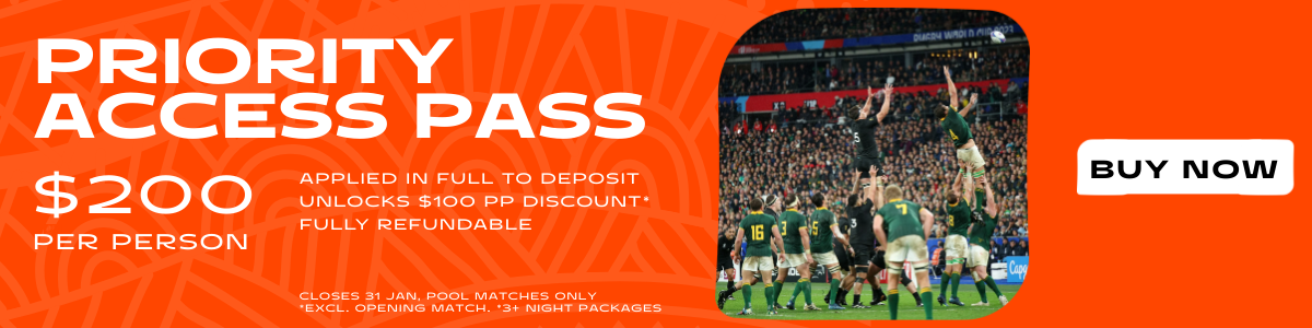 Booking with Events Travel provides access to guaranteed official match tickets and all-in-one Rugby World Cup packages that combine tickets, accommodation and optional hospitality and travel services in a single, seamless booking. Packages are designed to suit a wide range of travel styles, from value-focused stays to premium and fully curated rugby experiences, without the complexity of organising each component separately. Additional benefits may include priority access to high-demand matches, expert curation, cost efficiencies and exclusive experiences.